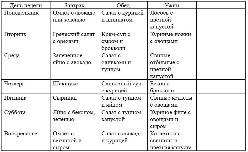 Необязательно соблюдать именно такое меню на неделю в кето-диете. Главное, чтобы основа рациона состояла из жирных продуктов, но при этом в него обязательно нужно включить свежие овощи, белковые блюда.
