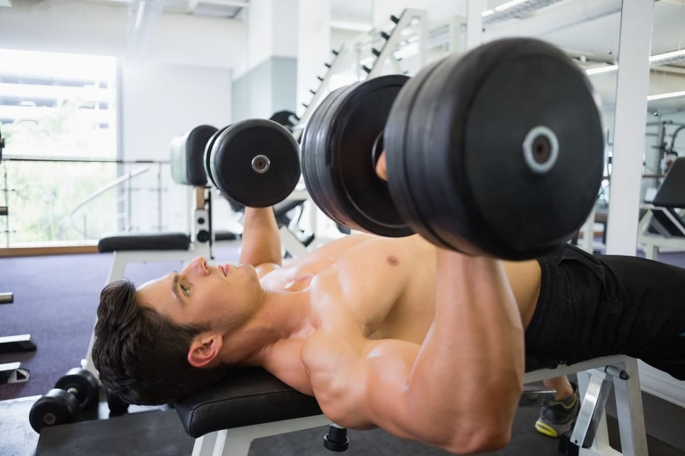 - Візьміть гантелі хватом зверху, розташовуючи руки трохи ширше плечових суглобів. Початкова позиція – снаряди знаходяться на рівні верхньої частини грудей.