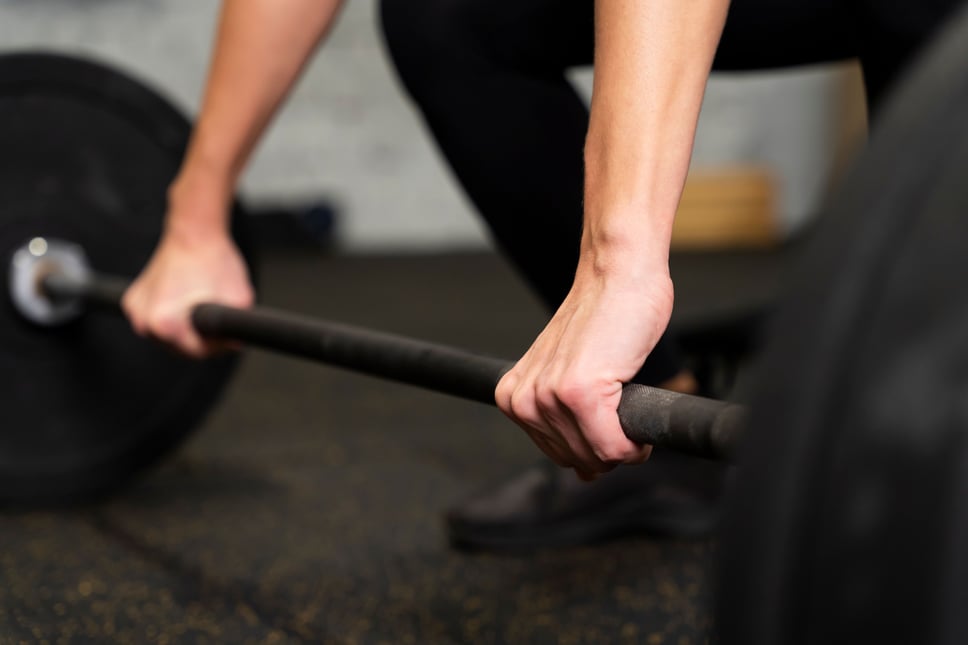 - Розсуньте руки на 5-7 см і візьміть штангу (нижній хват). Покладіть передпліччя на стегна так, щоб вони розміщувалися під невеликим кутом до плечей, а штанга і зап'ястя трохи звисали з колін.