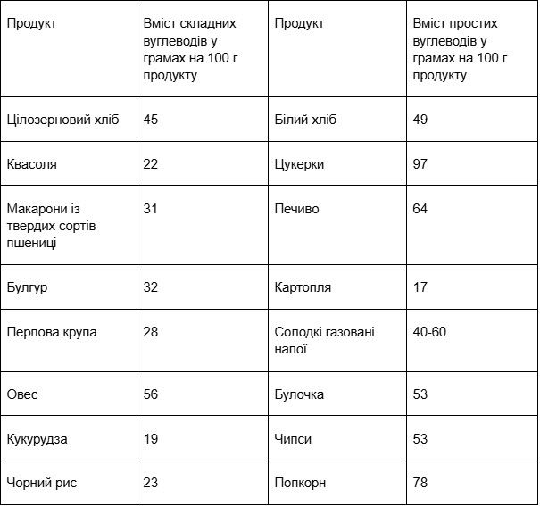 Отже, ми з вами розібралися, які вуглеводи корисні, а які ні. Тепер переходимо до наступного завдання: як скласти свій раціон, щоб харчування приносило максимальну користь. Спортсменам рекомендується включати в меню продукти з домінуванням повільних вуглеводних сполук до заняття, а прості — в обмеженій кількості та переважно після фізичного навантаження для відновлення глікогену. Нижче називаємо прості та складні вуглеводи, таблиця з деякими продуктами для прикладу та вмістом у них цих сполук допоможе грамотно скласти збалансоване меню.