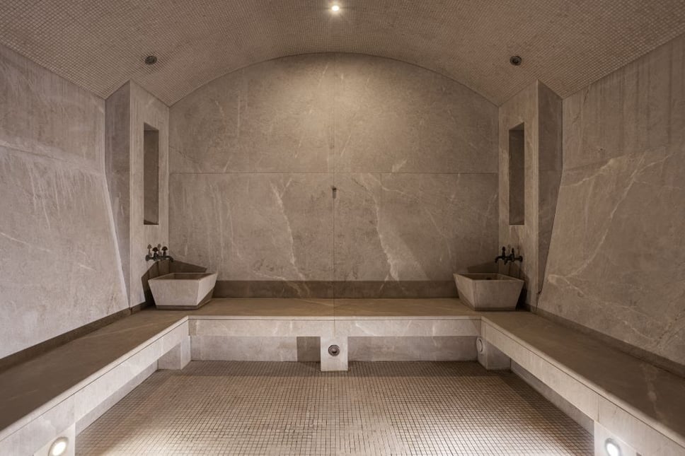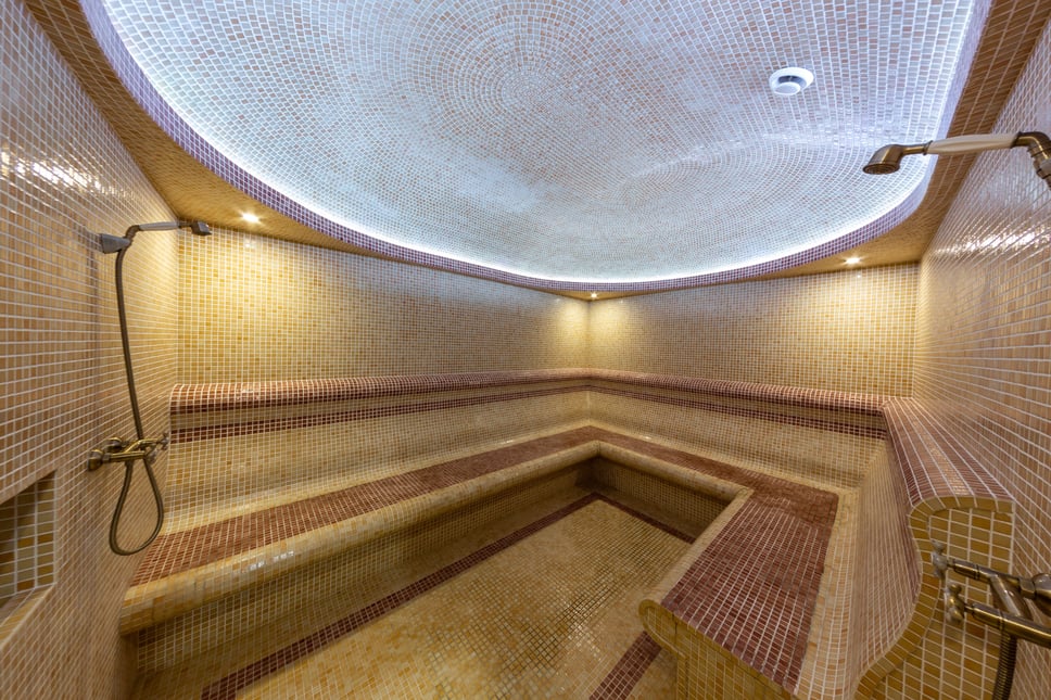 - Класичний інтер'єр. Приміщення лазні терми оздоблене мармуровою мозаїкою - нею викладені стіни, стеля, підлога та лави для лежання. Мармур - це один із найпрестижніших і найвишуканіших натуральних каменів, який використовується в інтер'єрі з давніх-давен. Крім того, мармур прекрасно утримує тепло, тому в парній довго підтримується правильний рівень тепла і вологості повітря.