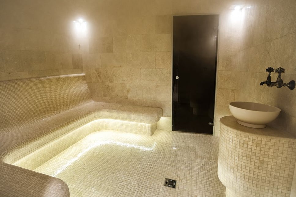 Турецька лазня з м'якою парою та помірною температурою наповнена затишком, відчуттям повного спокою та безпеки. Це місце ідеально підходить для глибокого релаксу та відновлення сил, куди можна приходити навіть із дітьми після басейну чи джакузі, щоб зігрітися після плавання.